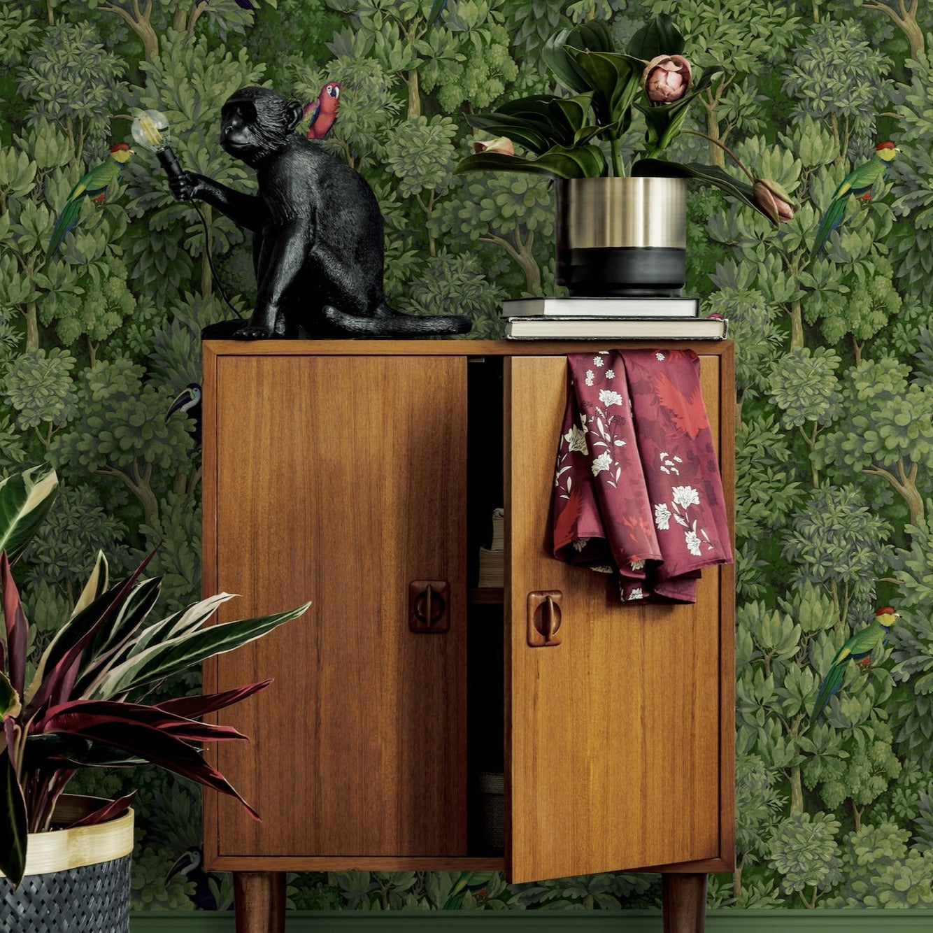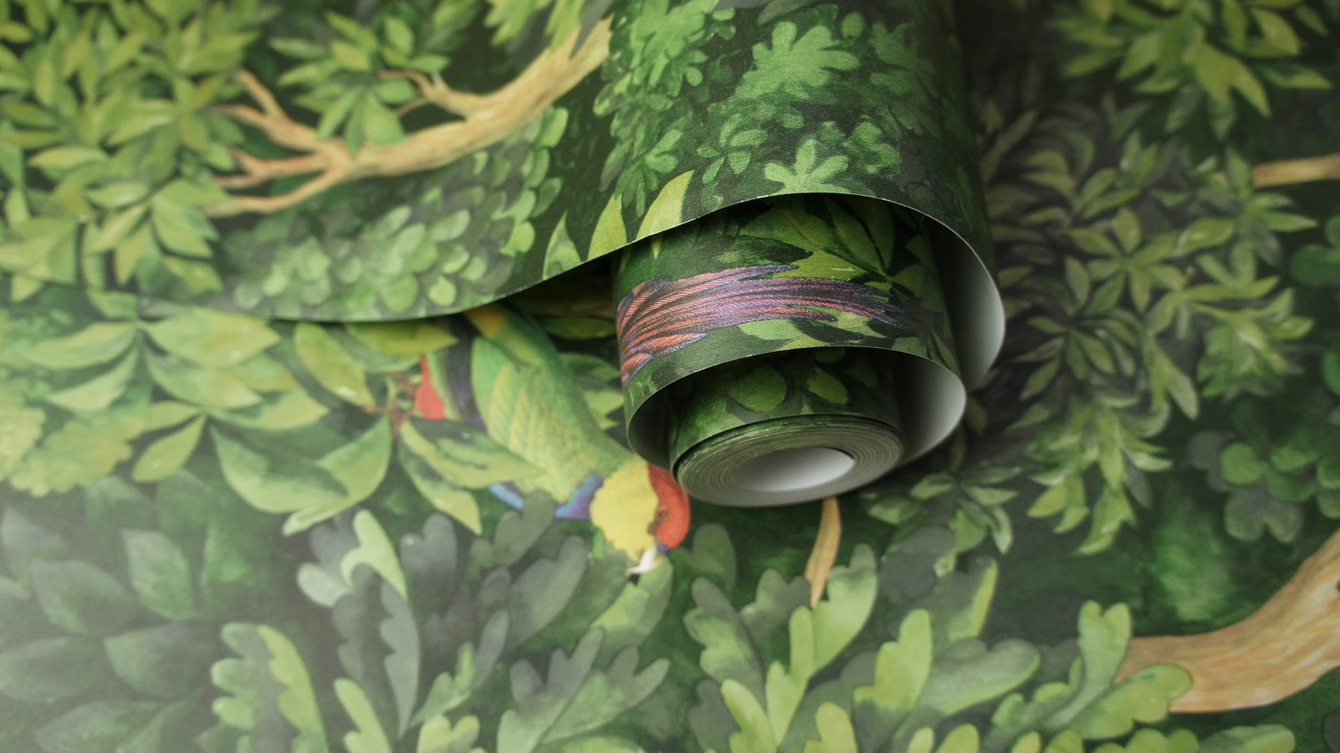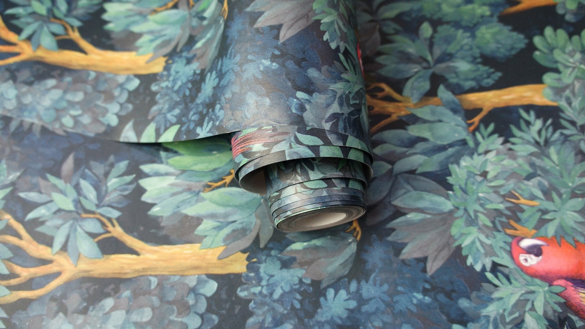 A gorgeously, layered jungle wallpaper featuring Parrots and Toucans.