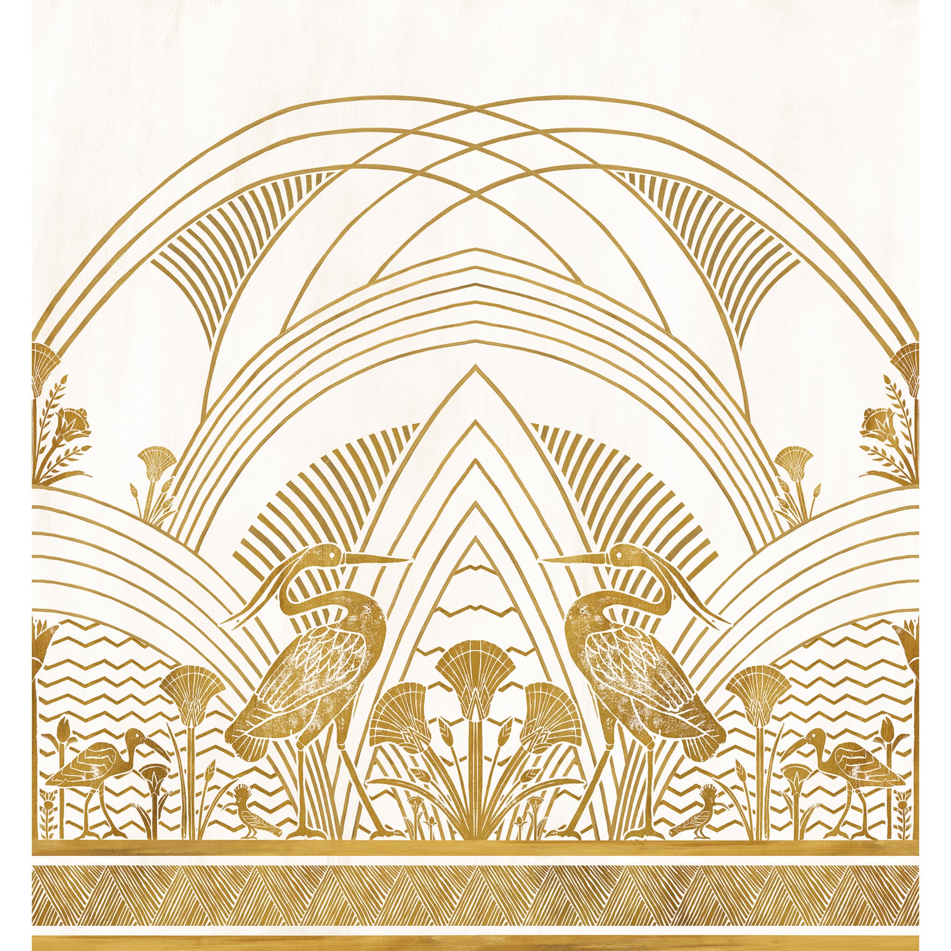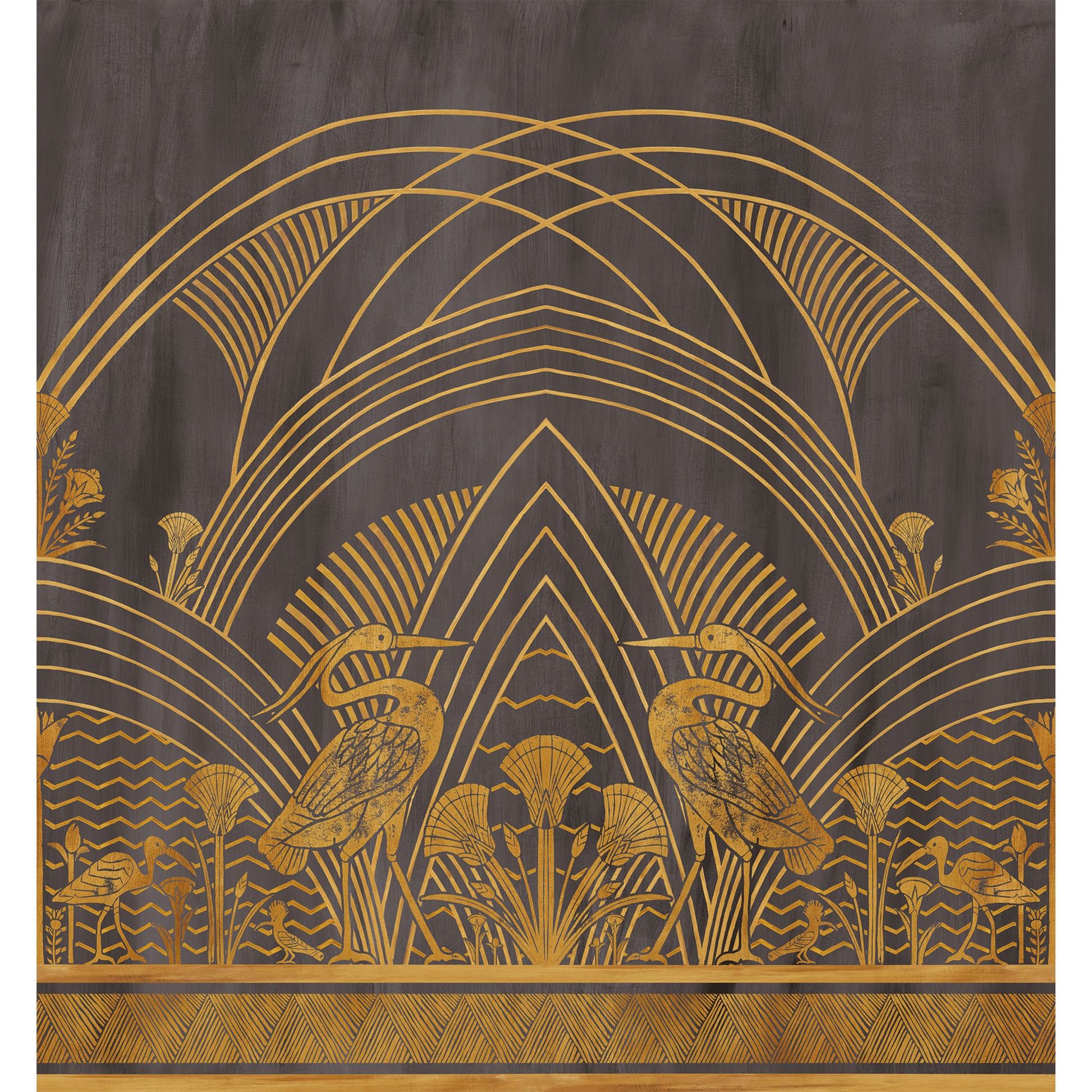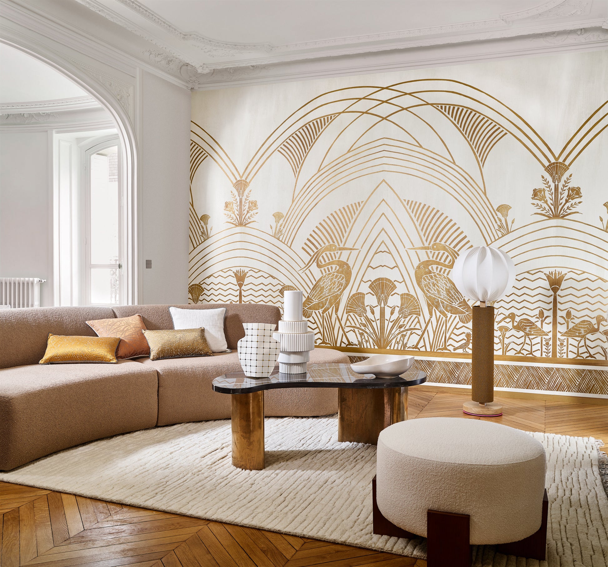 Close to a nature reserve, Elephantine Island is home to ibis and grey herons in the heart of a lush palm grove. At the meeting point of Egyptian imagery and Art Deco composition, this panoramic depicts herons with a reflective effect. Inspired by Ancient Egypt, Elephantine has been created by the Casamance design studio. Hand-engraved stamps are dipped in ink then applied giving an aged look and displaying exquisite material effects. Composed of four drops and digitally printed on a metallic base, the panoramic wall panel is 280cm wide.