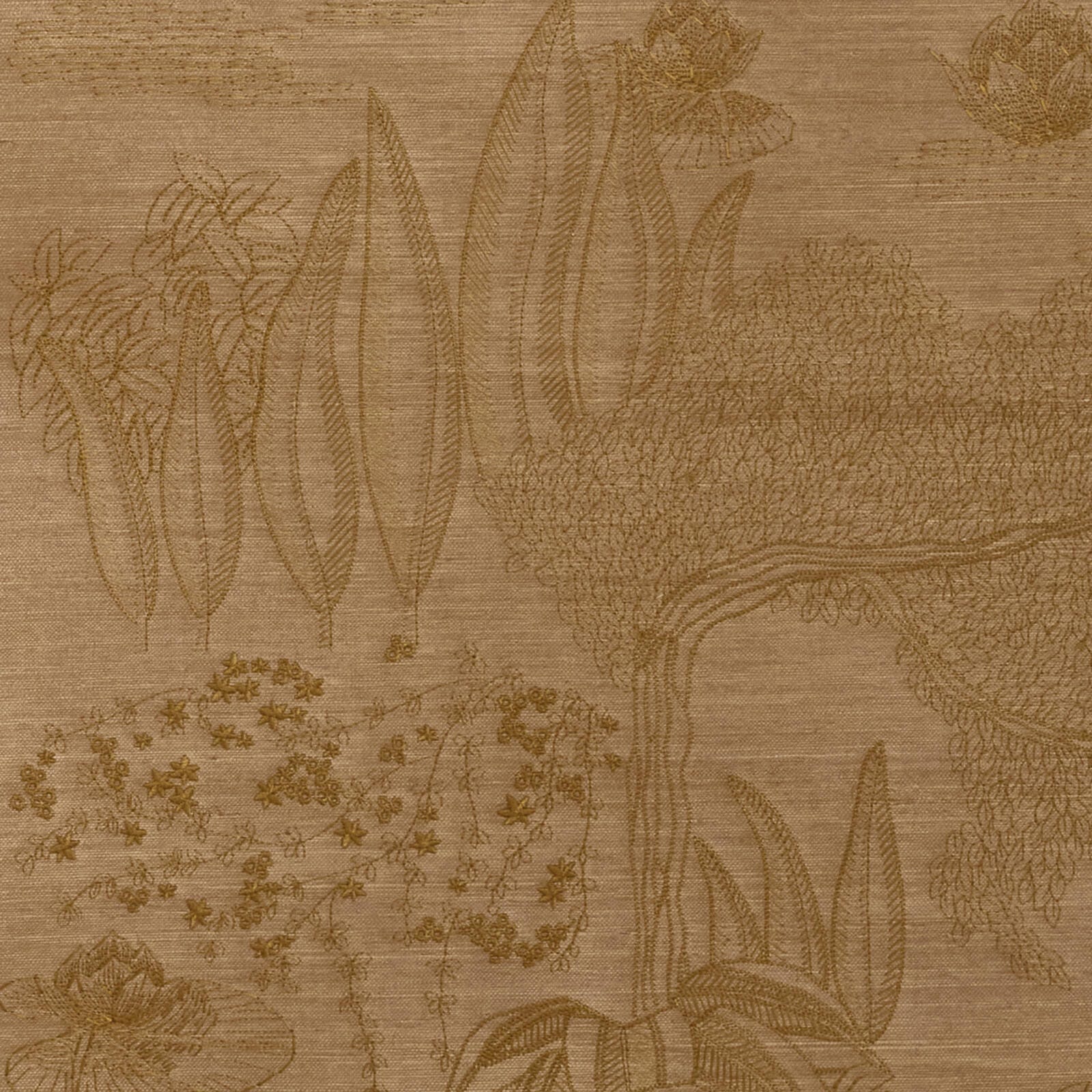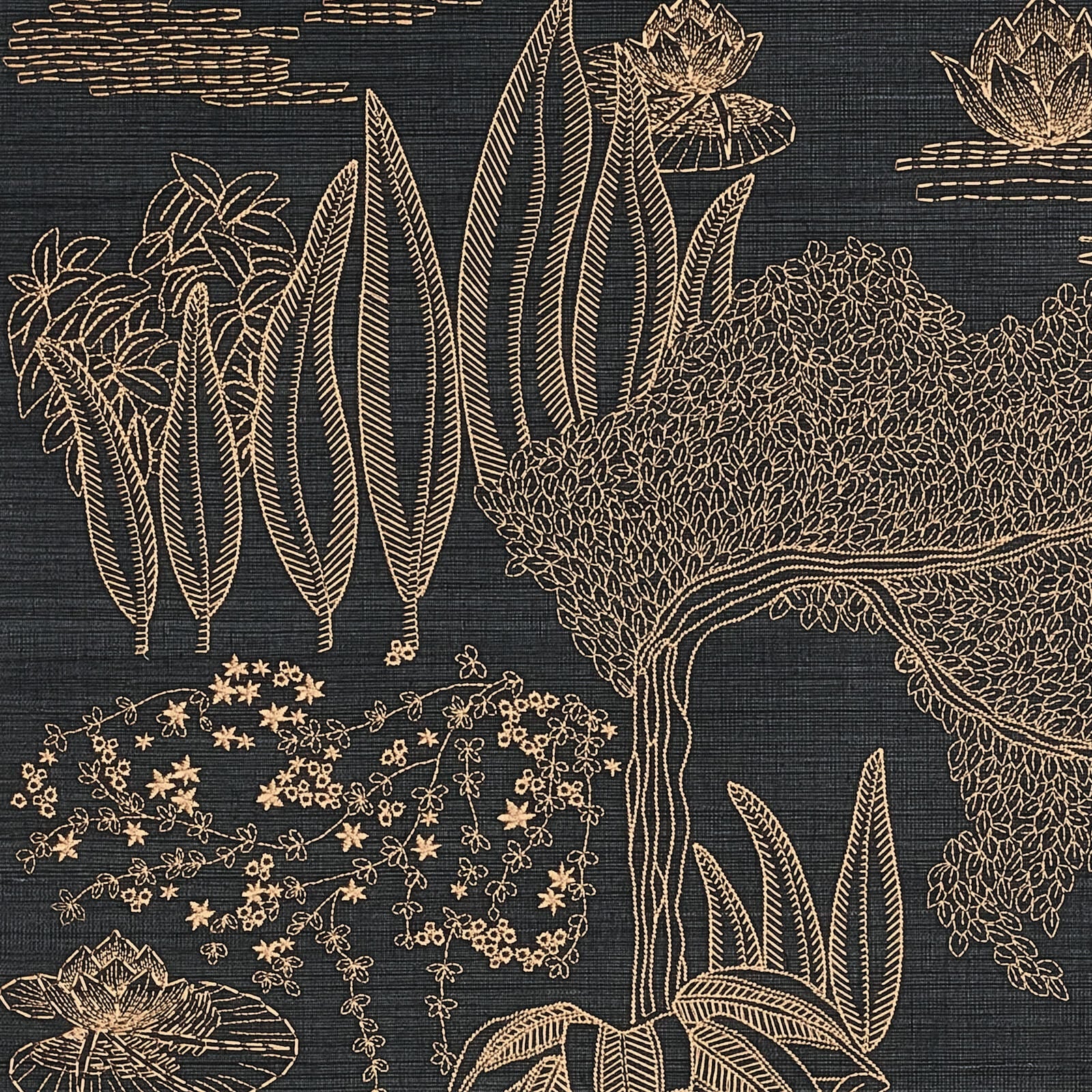 A symbol of purity, the lotus flower has a special significance in Japan. In an infinitely refined garden, HASU appears on the water’s surface, surrounded by flowering willows, irises and jasmine. The influence of Japanese art is felt here in the delicacy of the composition, the soft undulating lines, the perspective and the patterns. This composition of plants and flowers is embroidered on sisal and available in four versions: a black base embroidered with a copper yarn, a natural base embroidered with a bronze yarn, and an ivory base embroidered with white or verdigris.