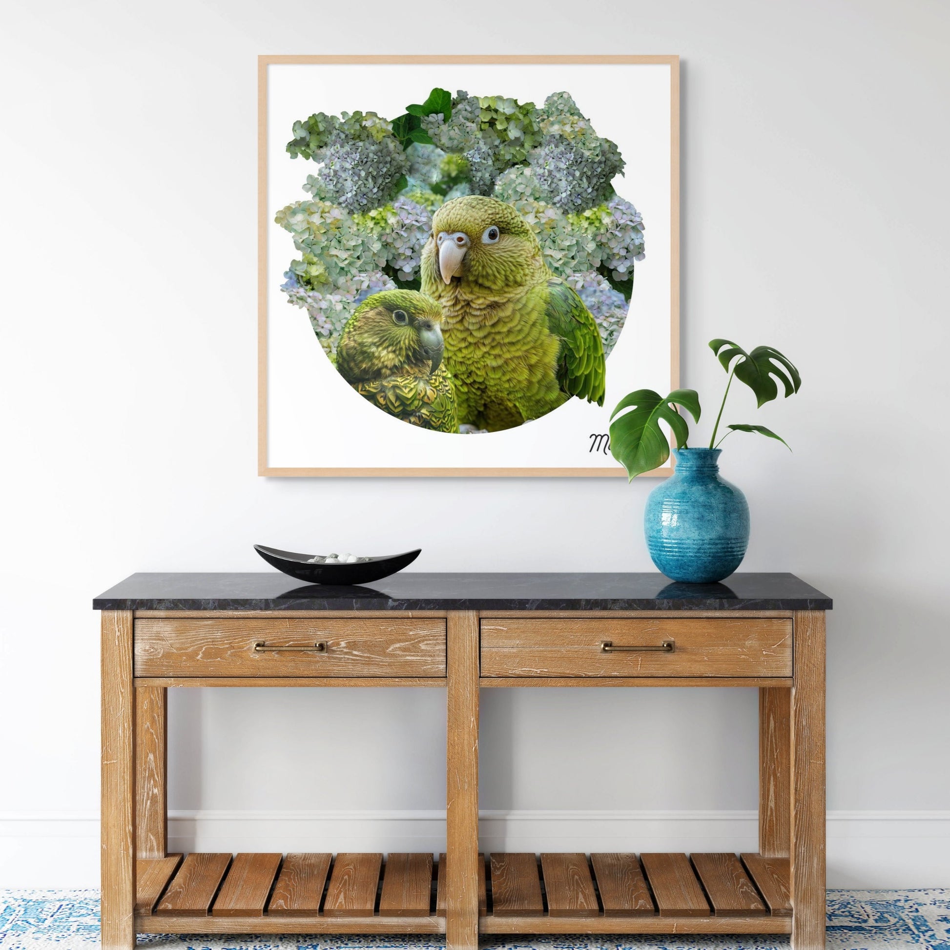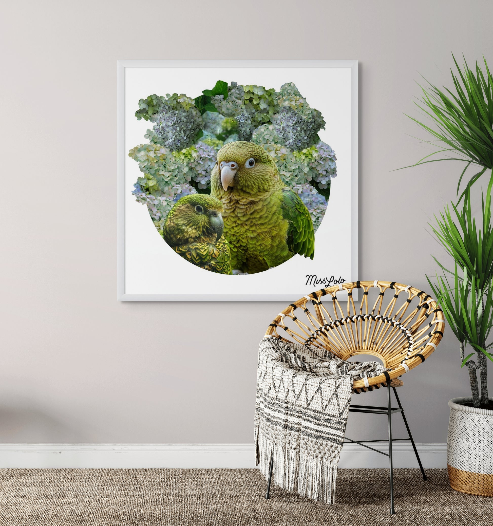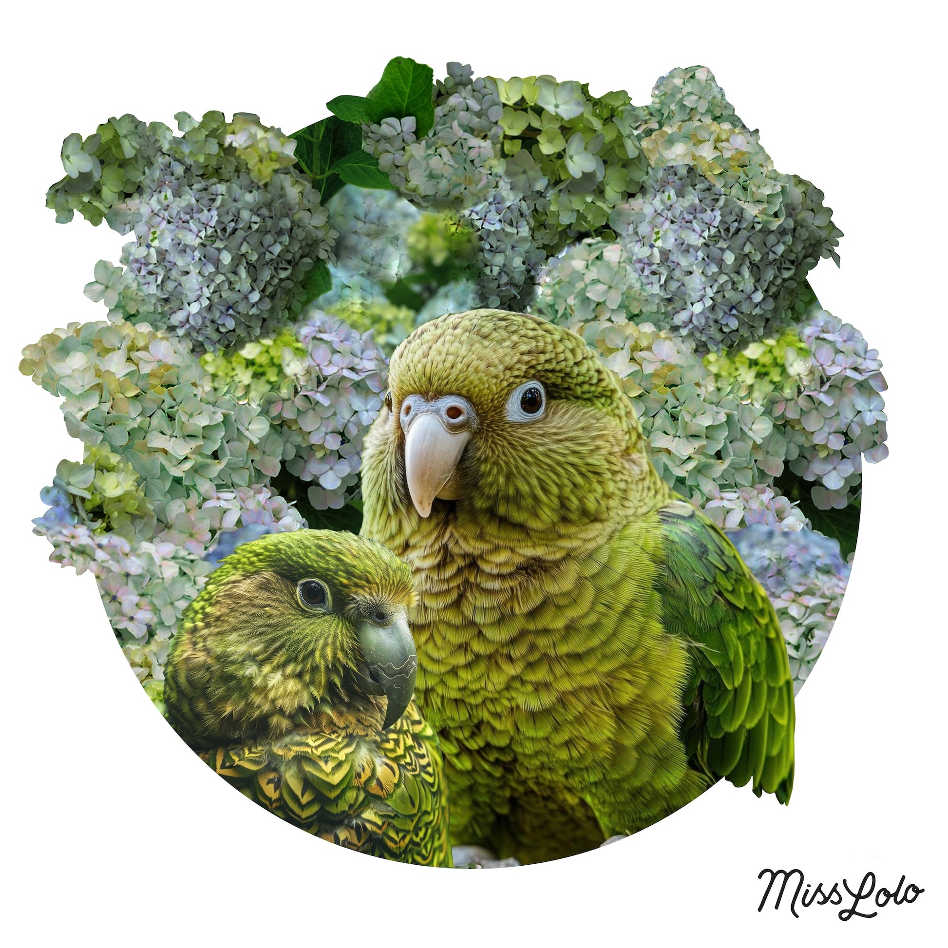 A beautiful kiwi twist on one of Miss Lolo's wallpapers, Happy Hydrangea, featuring two Kakapo parrots.