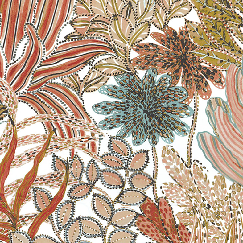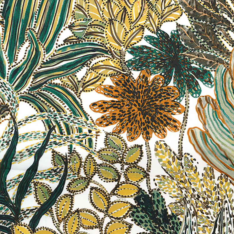 On the softness of a cotton satin spreads deep and lush vegetation. Lush foliage and blooming flowers come together to create a modern and bold fabric.
