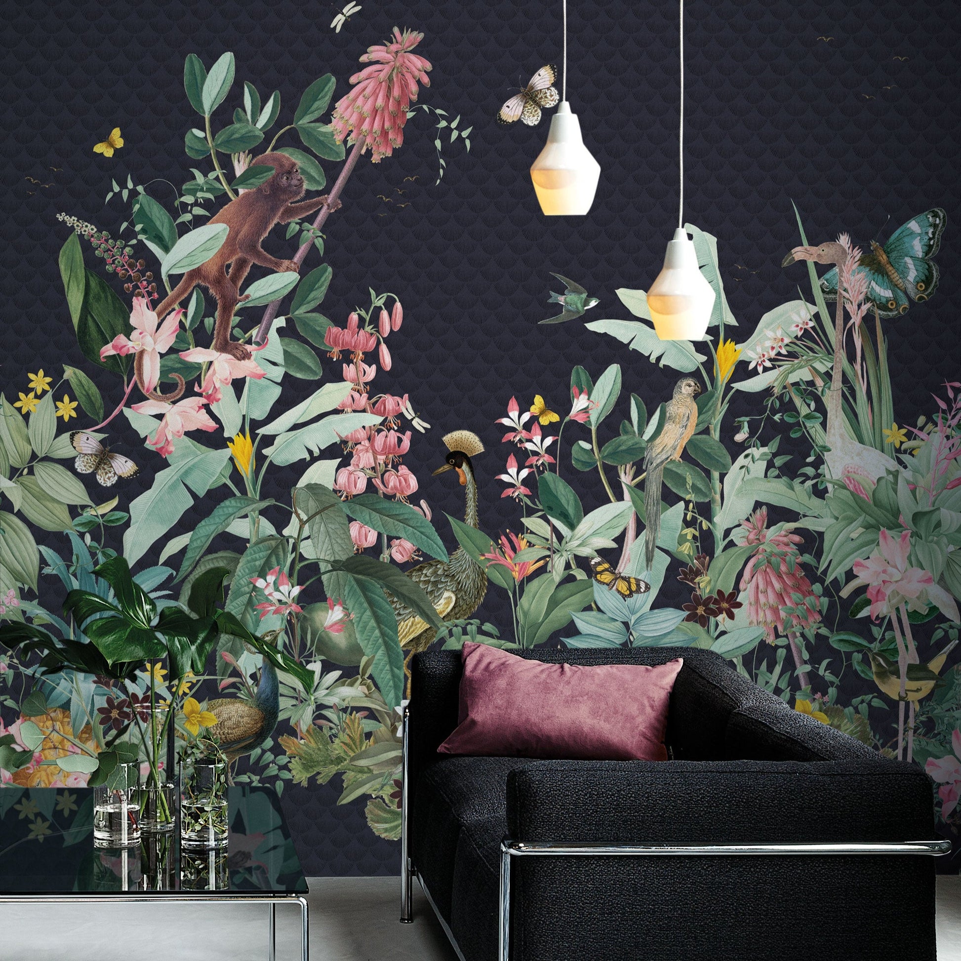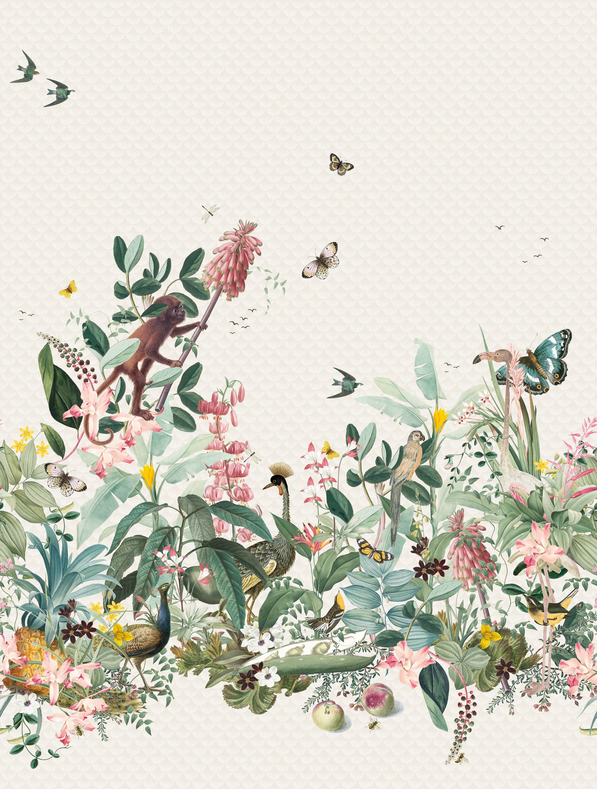 Drawings from the archives of the Rijksmuseum and the New York Library were the inspiration for the floral SO AVANTGARDENING! design. This wallpaper tells the story of a colourful garden, enticing you to go on a journey of discovery. The intense, colourful and imaginative pattern repeat is displayed on a calm background of cream and dark blue. The pattern is executed in a digital print on a high-quality vinyl-coated non-woven base and coordinates beautifully with the plain colours of the JAMILA wallpaper. The new design is repeated horizontally and available in 212 cm width and 280 cm height, divided into two lengths, as a standard.