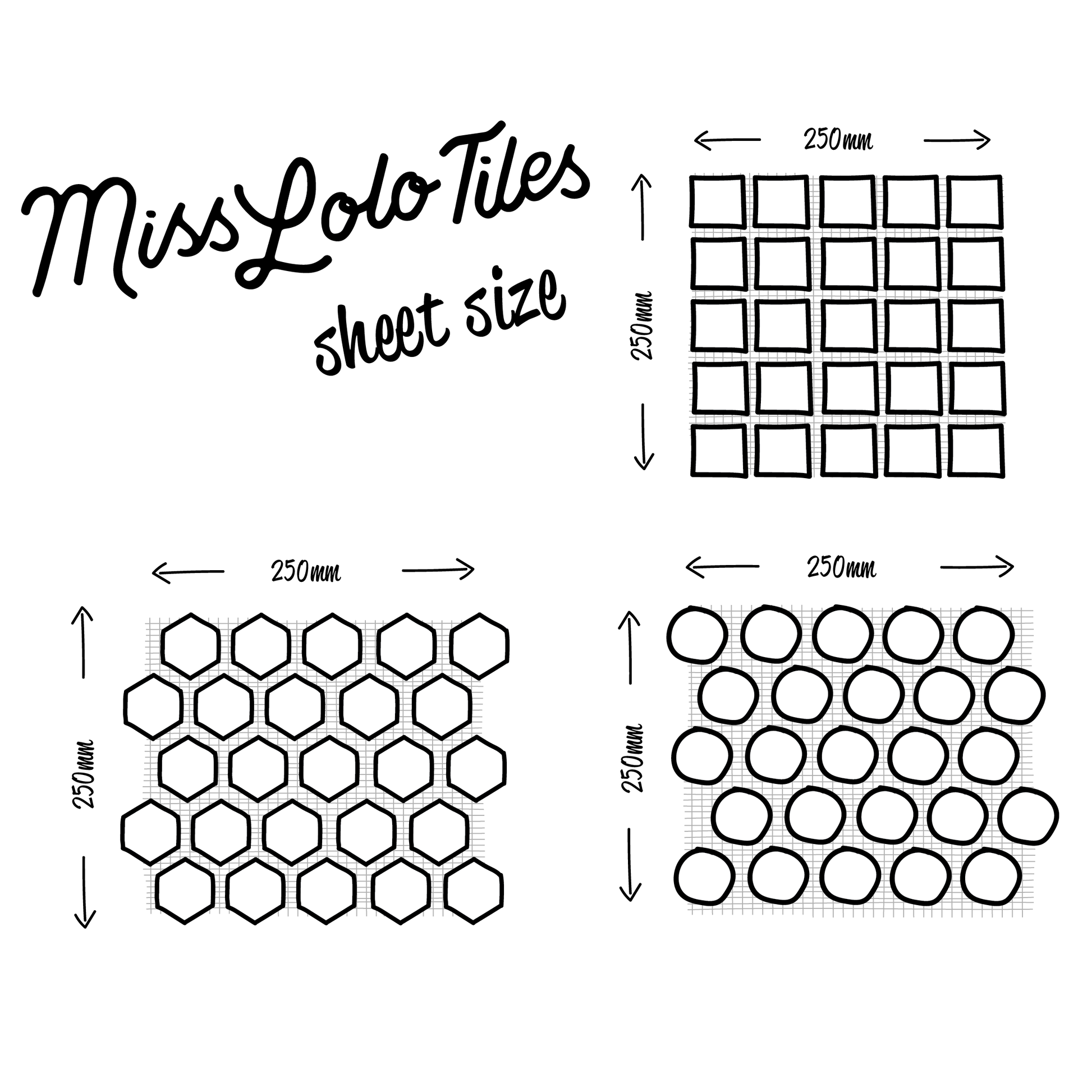 Tiles are supplied on 'netting' like regular tiles and are approx. 250x250mm (9.84" x 9.84") in total sheet size.