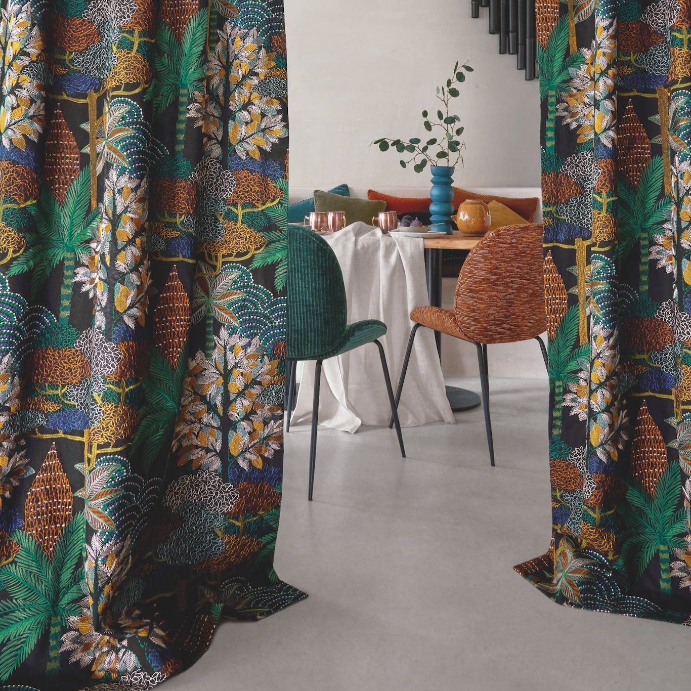It begins with the tentative chirping of one bird. Then a whole chorus erupts from these imaginary trees, coloured like the feathers of peacocks and birds of paradise. “Voyage imaginaire” introduces a landscape at dawn, when nature reawakens. With small Impressionist strokes, the colours come together and merge into flamboyant bushes. Dawn breaks to reveal the beauty of the landscape and, on the fabrics, plumage, colours, and foliage become one.